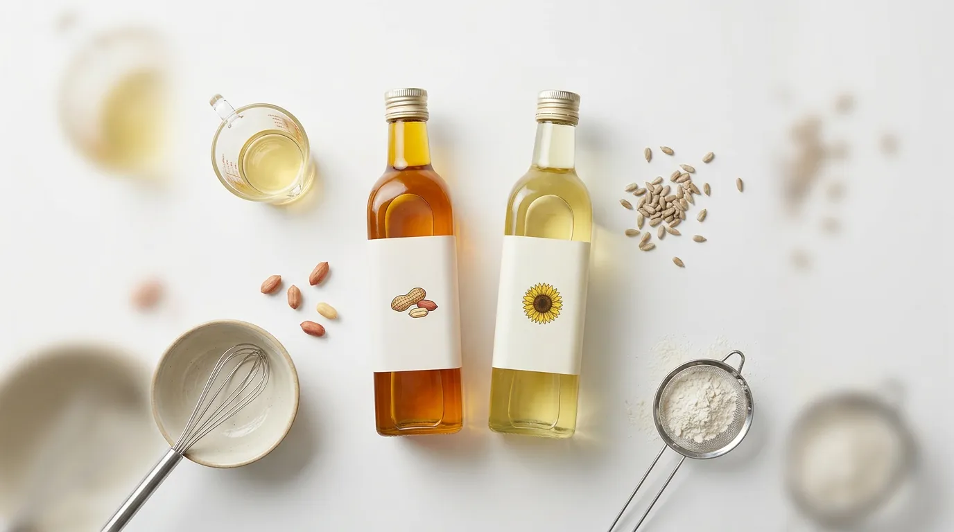Sin diferencia estructural. Ambos aceites se comportan de forma idéntica en la masa: lubrican la red de gluten o almidón, atrapan aire durante el batido y producen una miga tierna. El punto de humo del girasol es similar al del cacahuete, así que no hay riesgo de degradación al hornear.