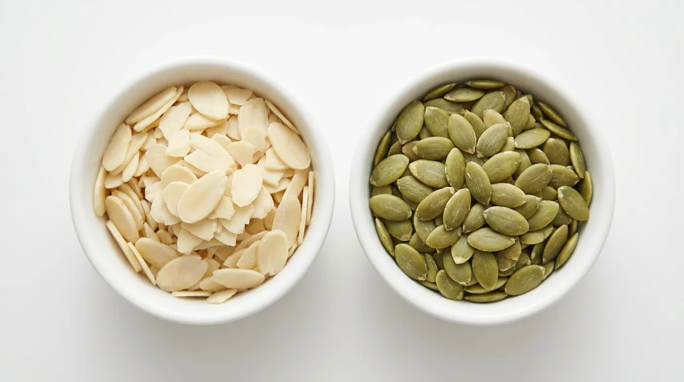 Similar en contenido graso, aunque las pepitas tienen más proteína y menos carbohidratos que las almendras. Si se muelen para incorporar a la masa, producen una textura ligeramente más densa y oleosa. Como topping o mezcla, su contribución estructural es equivalente. Son más pesadas que las láminas de almendra, así que en la superficie de un bizcocho pueden hundirse ligeramente más.