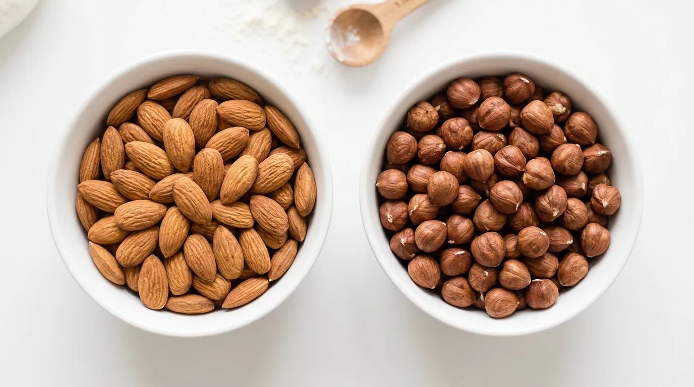 Las avellanas tienen más grasa y menos proteína que las almendras. En recetas que dependen de almendras molidas como componente estructural (tarta de Santiago, macarons), la masa será algo más blanda. Reduce la grasa añadida en 1 cucharada por cada 100g de avellanas usadas.