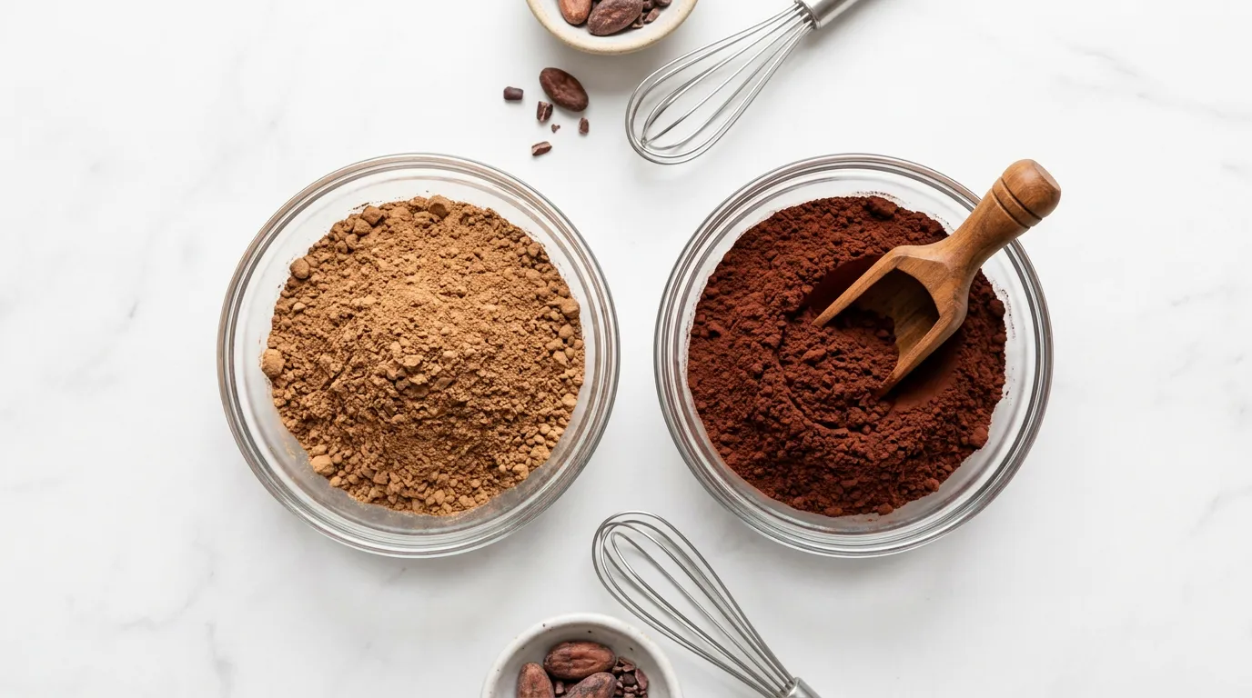 Aquí está el cambio crítico: el cacao holandés es alcalino (pH 7-8), mientras que el crudo es ácido (pH 5-6). Si tu receta usa bicarbonato como leudante, necesita la acidez del cacao para activarlo. Con cacao holandés, el bicarbonato no reaccionará correctamente y el horneado no subirá bien. Deberás cambiar el bicarbonato por polvo de hornear (que trae su propio ácido incorporado).