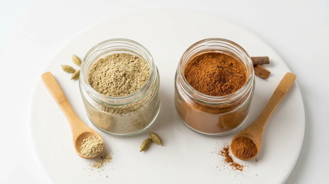 El cardamomo tiene un perfil floral, cítrico y mentolado que la canela no puede replicar — son especias de mundos diferentes. La canela aporta un calor dulce y envolvente, más familiar y reconfortante, pero pierde toda la complejidad floral y las notas frescas del cardamomo. Añadir una pizca de jengibre molido ayuda a recuperar algo de la calidez picante, creando un perfil de especias cálidas que, aunque diferente, resulta igualmente agradable.