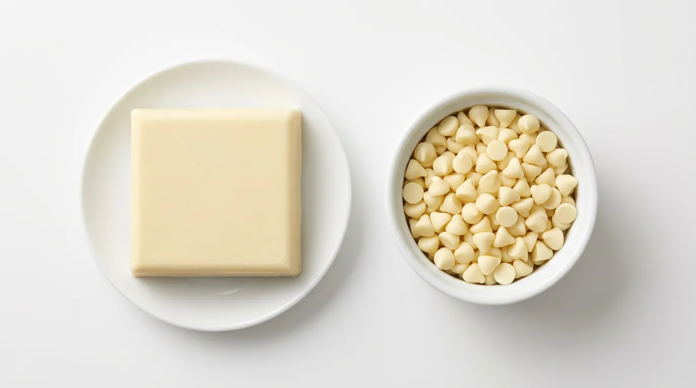 El sabor es prácticamente idéntico — ambos son chocolate blanco al fin y al cabo. La única diferencia perceptible es que algunos chips de menor calidad pueden tener un sabor ligeramente más artificial debido a los estabilizantes y emulsionantes añadidos. Si usas chips de una marca decente, nadie notará la diferencia en el producto final.