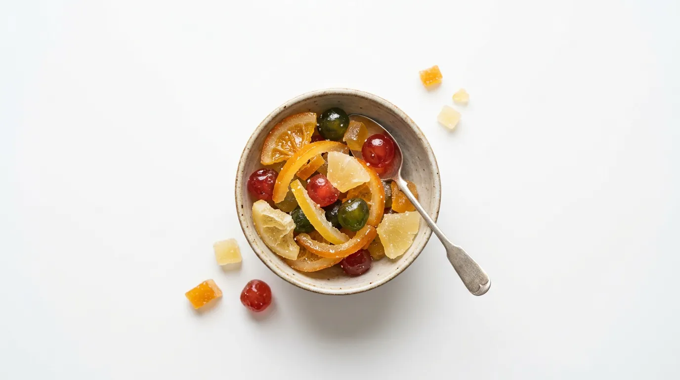 Las frutas confitadas de calidad se distinguen por conservar cierta textura de la fruta original, no por ser bloques translúcidos de azúcar con colorante. Si las tuyas brillan como semáforos, quizá conviene buscar una marca mejor.