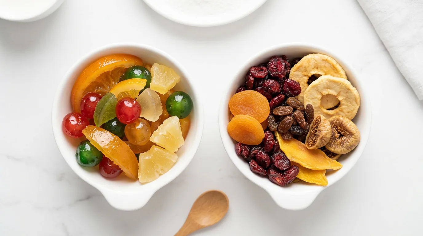 La fruta deshidratada es más masticable y flexible que la confitada, que tiende a ser más firme y pegajosa. En horneados, las frutas deshidratadas absorben humedad de la masa y se ablandan, integrándose mejor. No aportan el mismo contraste crujiente-blando que las confitadas.