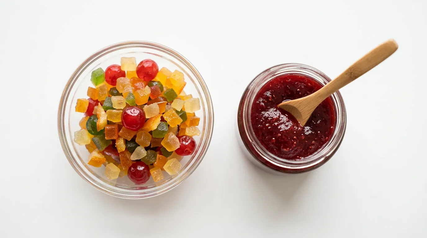 La mermelada aporta un sabor afrutado intenso y concentrado, pero uniforme — pierdes la variedad de sabores que las distintas frutas confitadas ofrecen. Usa una mermelada de naranja amarga o de albaricoque para acercarte al perfil cítrico-dulce de las confitadas. El resultado es más mermelada y menos Navidad, pero sigue siendo delicioso.