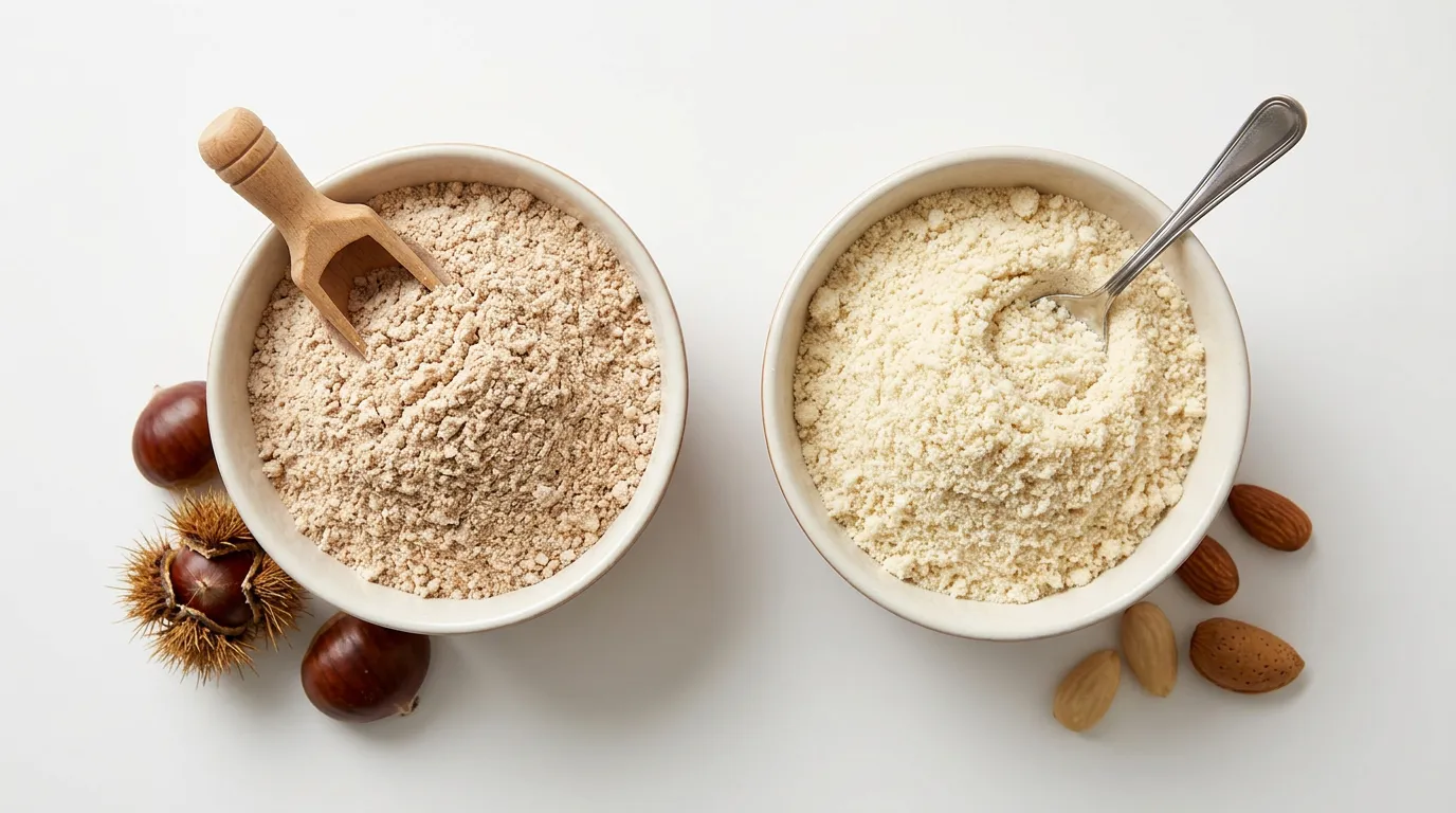 La harina de almendra produce una miga más húmeda y densa debido a su alto contenido en grasa (50% vs 3.7%). Los horneados quedan más ricos y untuosos pero más pesados. La castaña produce una miga más ligera y con más estructura gracias a su mayor contenido en almidón.