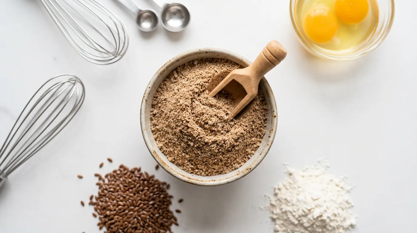 La harina de lino (o linaza molida) es una de las herramientas más versátiles de la repostería vegana: mezclada con agua (1 cucharada de harina + 3 de agua, reposar 5 minutos) forma un gel mucilaginoso que imita la función del huevo como aglutinante. Pero ojo: no la compres en grandes cantidades. Al ser rica en ácidos grasos omega-3, se oxida rápidamente una vez molida. Guárdala en el congelador y úsala en 3 meses como máximo. Si huele a pintura, ha rancificado — tírala sin remordimientos.