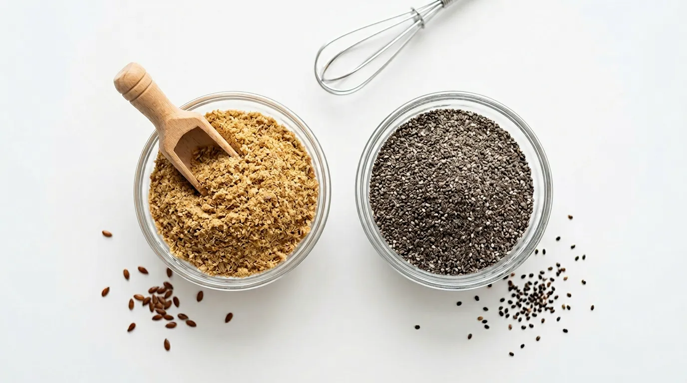 Ambas harinas forman gel mucilaginoso, pero la chía absorbe más líquido (hasta 12 veces su peso, frente a las 8 veces del lino). Esto significa que la masa puede quedar más espesa si no ajustas el líquido. La chía también produce una textura ligeramente más gelatinosa que la del lino.