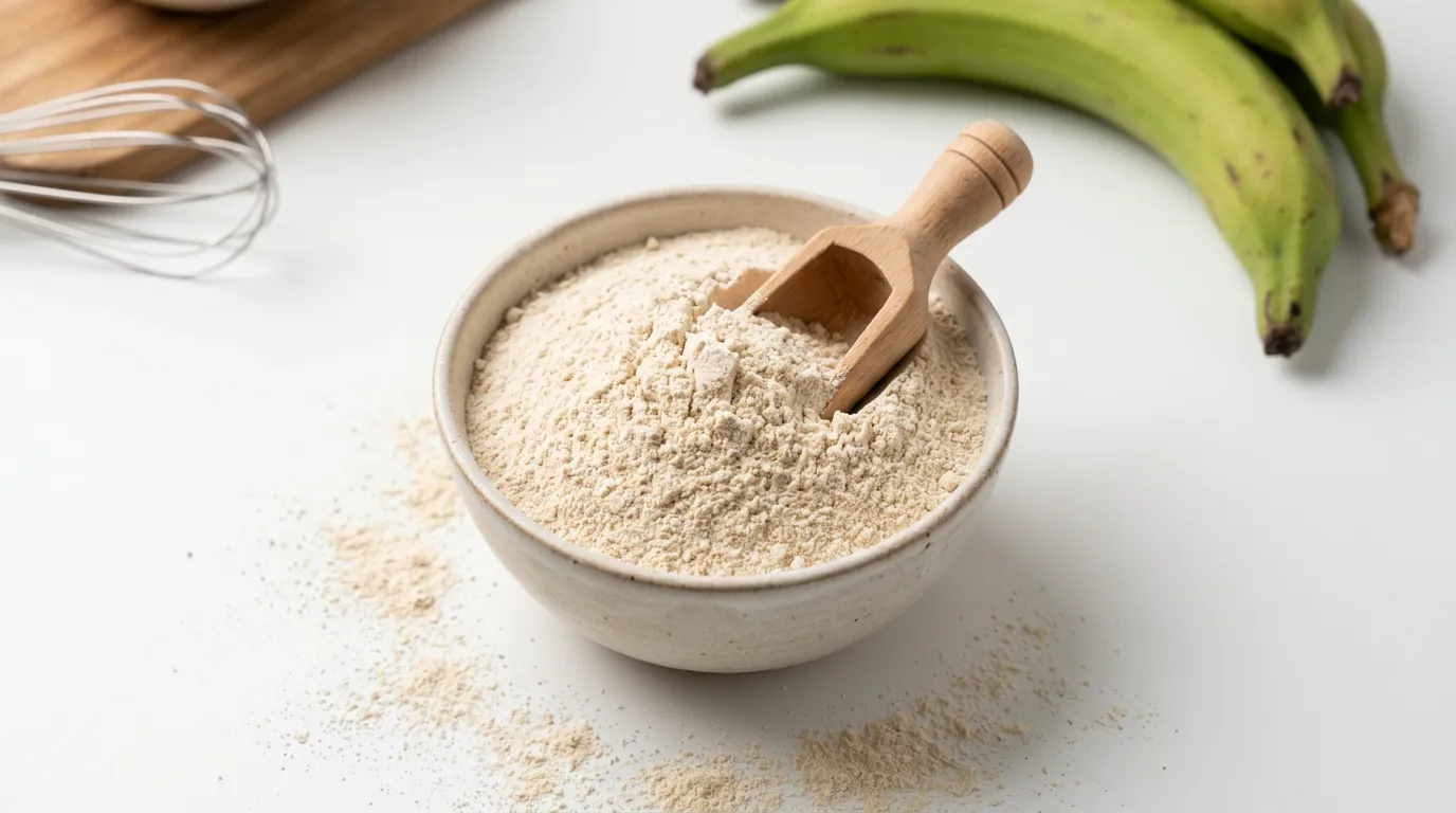 Se elabora con plátanos verdes (macho) deshidratados y molidos. Es rica en almidón resistente, lo que la hace interesante nutricionalmente. Absorbe mucho más líquido que la harina de trigo, así que la proporción nunca es 1:1 — usa menos harina de plátano de la que usarías de trigo.