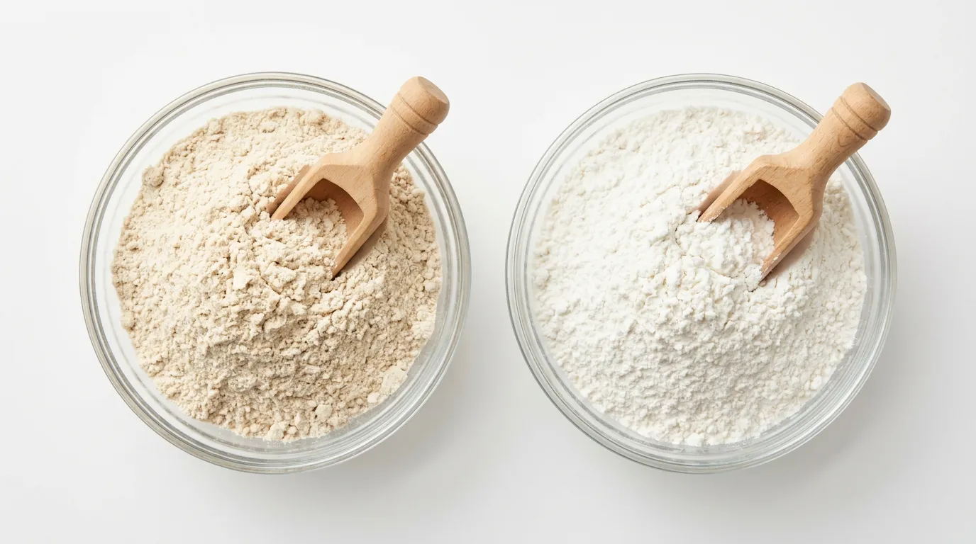 La yuca tiene más almidón y menos fibra, lo que produce estructuras más ligeras y aireadas que la harina de plátano. Puede ser necesario añadir un aglutinante (goma xantana, huevo) para compensar.