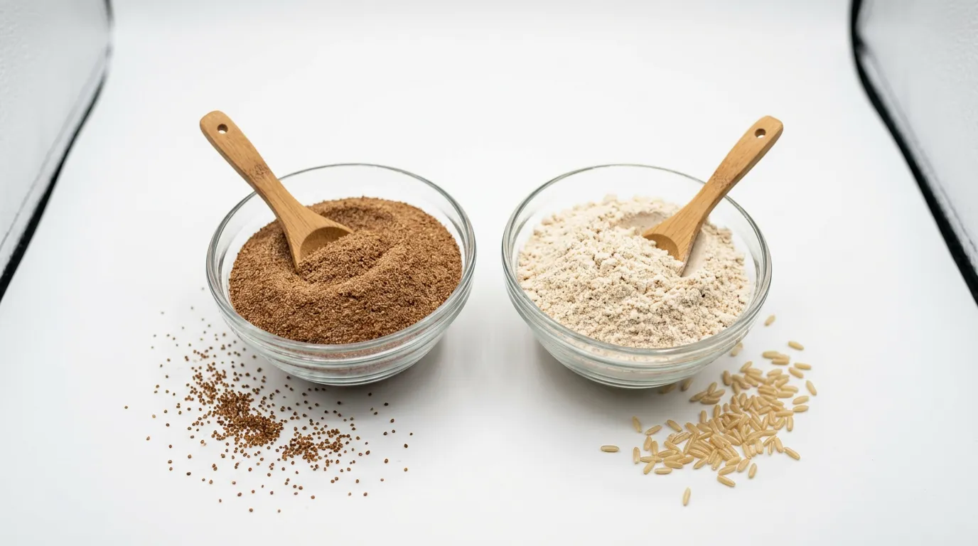 El teff tiene más proteína y fibra que la harina de arroz integral, lo que le da mejor estructura natural. La harina de arroz integral funciona bien pero puede producir resultados ligeramente más frágiles. Combinar con almidón de tapioca y goma xantana mejora la cohesión.