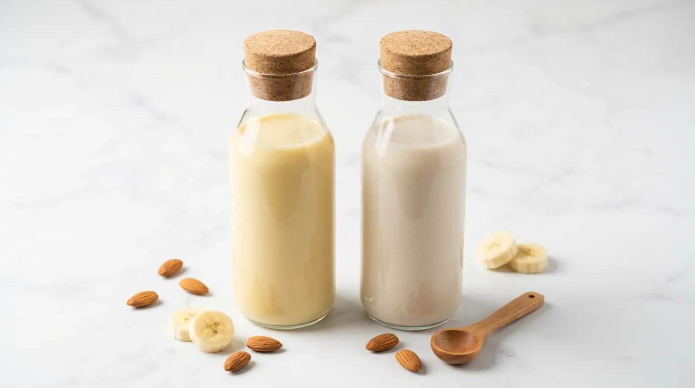 Esta es la sustitución más fiel en sabor. La leche de almendra aporta una base neutra con un sutil matiz a fruto seco, y el plátano añadido reproduce el dulzor frutal de la leche de plátano original. El resultado es muy similar, con la ventaja adicional de un ligero toque almendrado que complementa bien el plátano.
