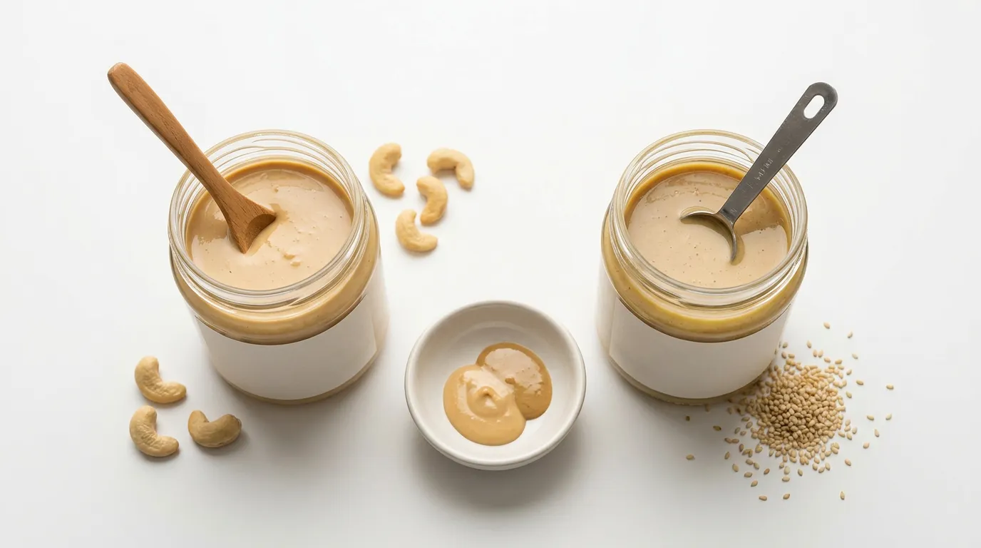 El tahini tiene más grasa y menos carbohidratos que la mantequilla de anacardo, lo que puede producir horneados ligeramente más planos y grasos. En brownies, esto se traduce en una textura más fudgy — generalmente deseable. En galletas, puede requerir un poco más de harina.