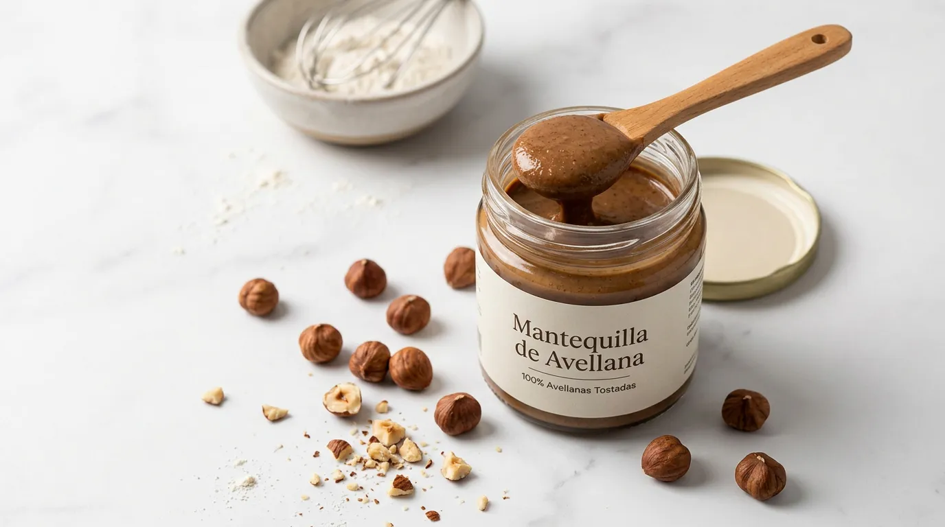 No confundas la mantequilla de avellana (100% avellanas molidas) con la Nutella o cremas similares, que contienen azúcar, aceite de palma y cacao además de avellanas. Para repostería, busca mantequilla de avellana pura sin azúcar ni aceites añadidos. Si no la encuentras en tienda, hazla tú mismo: procesa avellanas tostadas durante 8-10 minutos en un procesador de alimentos potente hasta obtener una pasta fluida. Paciencia: pasará de migas a bola a crema — confía en el proceso.