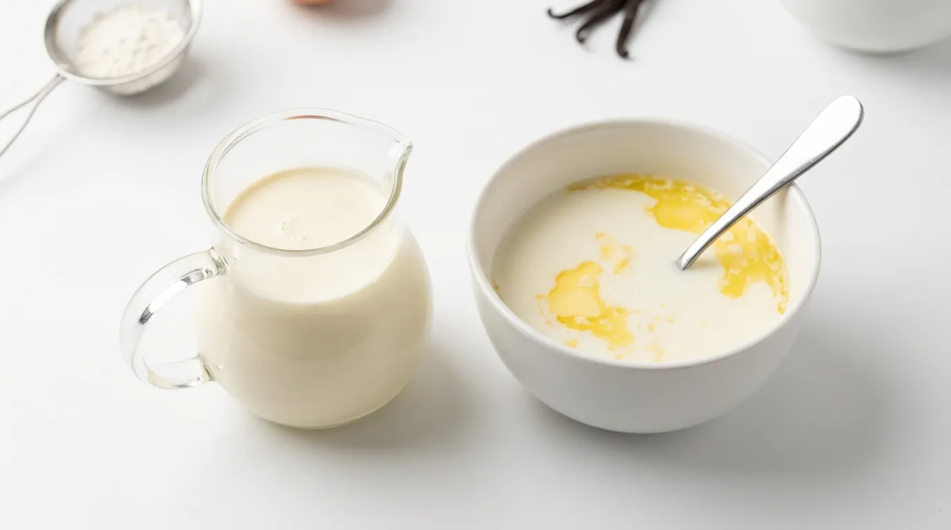 La combinación de leche entera y mantequilla derretida replica el contenido graso y la humedad de la nata líquida. Es la solución casera más accesible cuando te has quedado sin nata y la tienda está cerrada (o simplemente no te apetece salir).