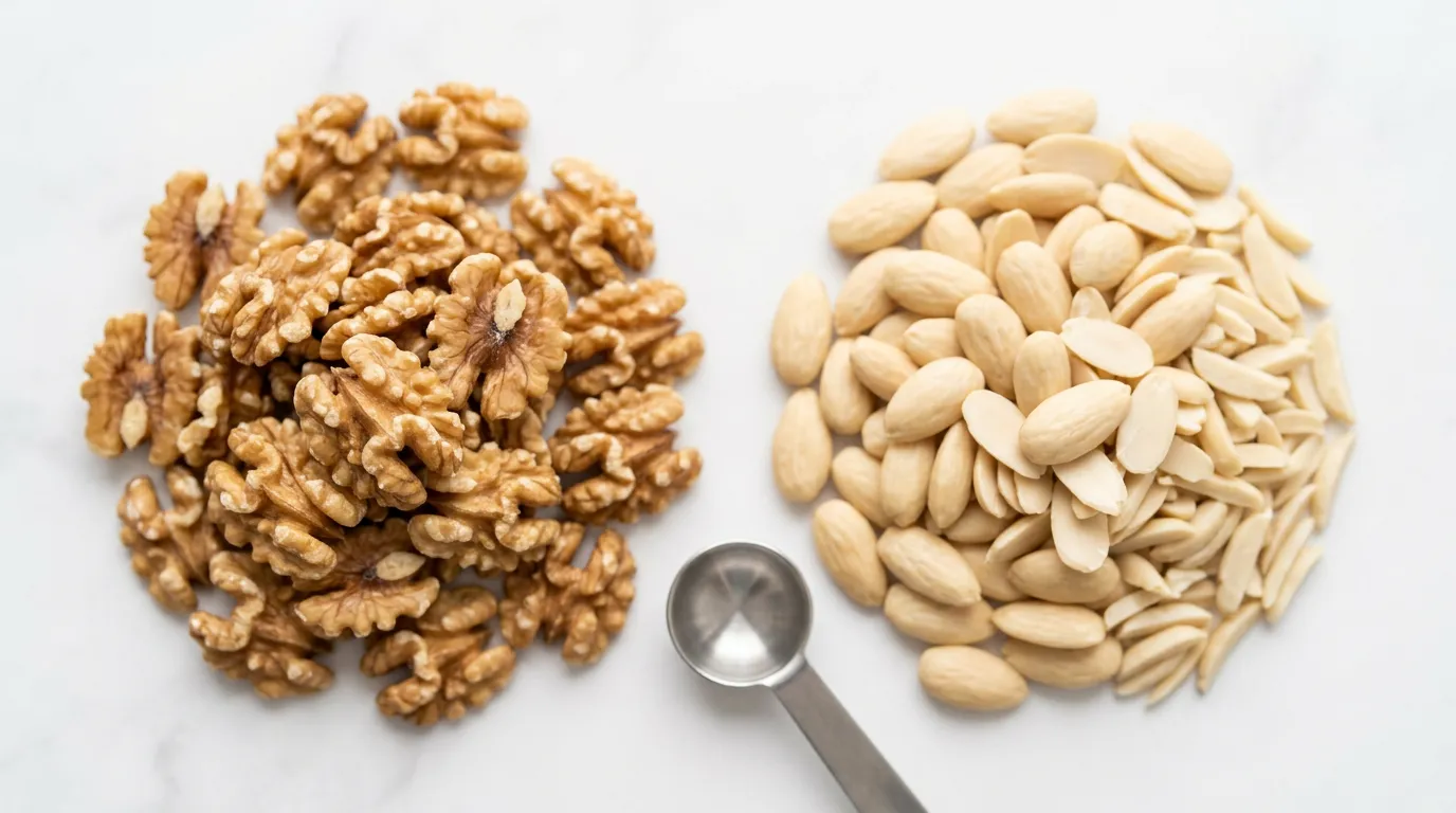 Las almendras son más duras y crujientes que las nueces. Picadas, mantienen más estructura durante el horneado. Esto puede ser una ventaja en galletas (más crujido) o un inconveniente en masas donde se busca que el fruto seco se integre más suavemente.