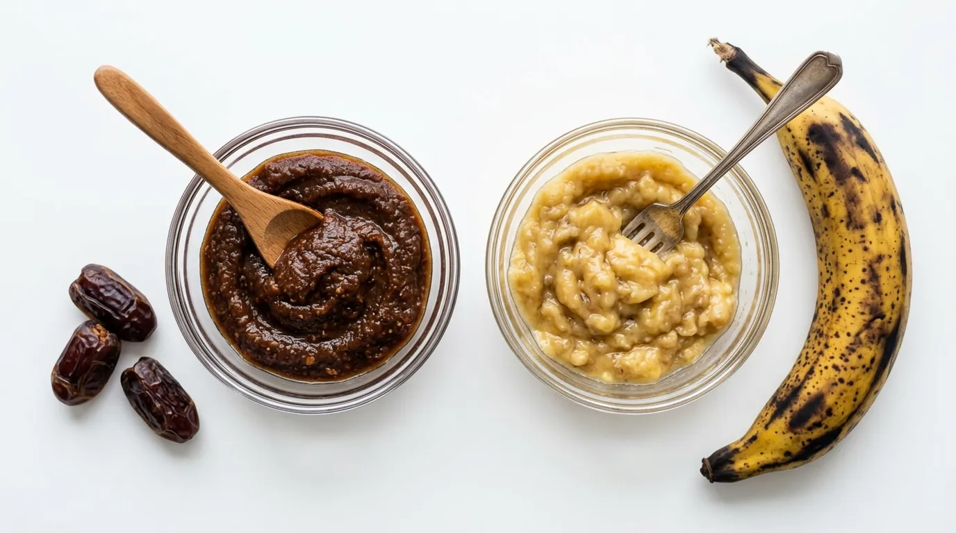 El plátano machacado aporta una humedad incluso mayor que el puré de dátiles y produce masas más densas y húmedas. Los bizcochos quedarán con una miga más compacta y jugosa. Las galletas serán más blandas y masticables. Es fundamental usar plátanos muy maduros — los verdes no endulzan lo suficiente y aportan una textura harinosa.