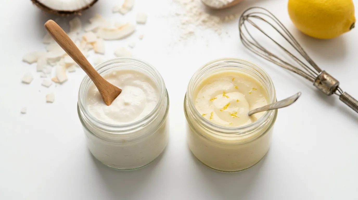 La crema de coco (la parte espesa de la leche de coco enlatada) mezclada con zumo de limón replica la acidez y cremosidad del yogur de coco. El limón aporta la fermentación ausente, creando un sabor ligeramente ácido sobre una base rica y grasa.